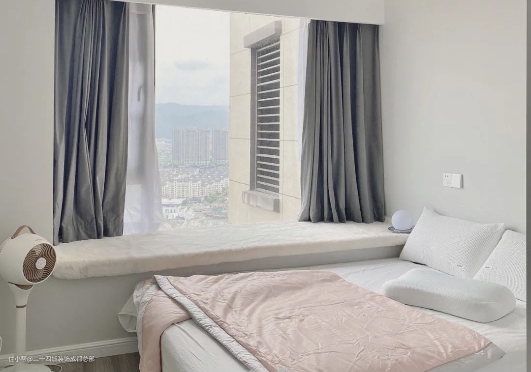 飘窗处设计了色系统一的白+灰双层窗帘,白色纱窗透光不透影,灰色窗帘遮光性很好,整体美观又实用。