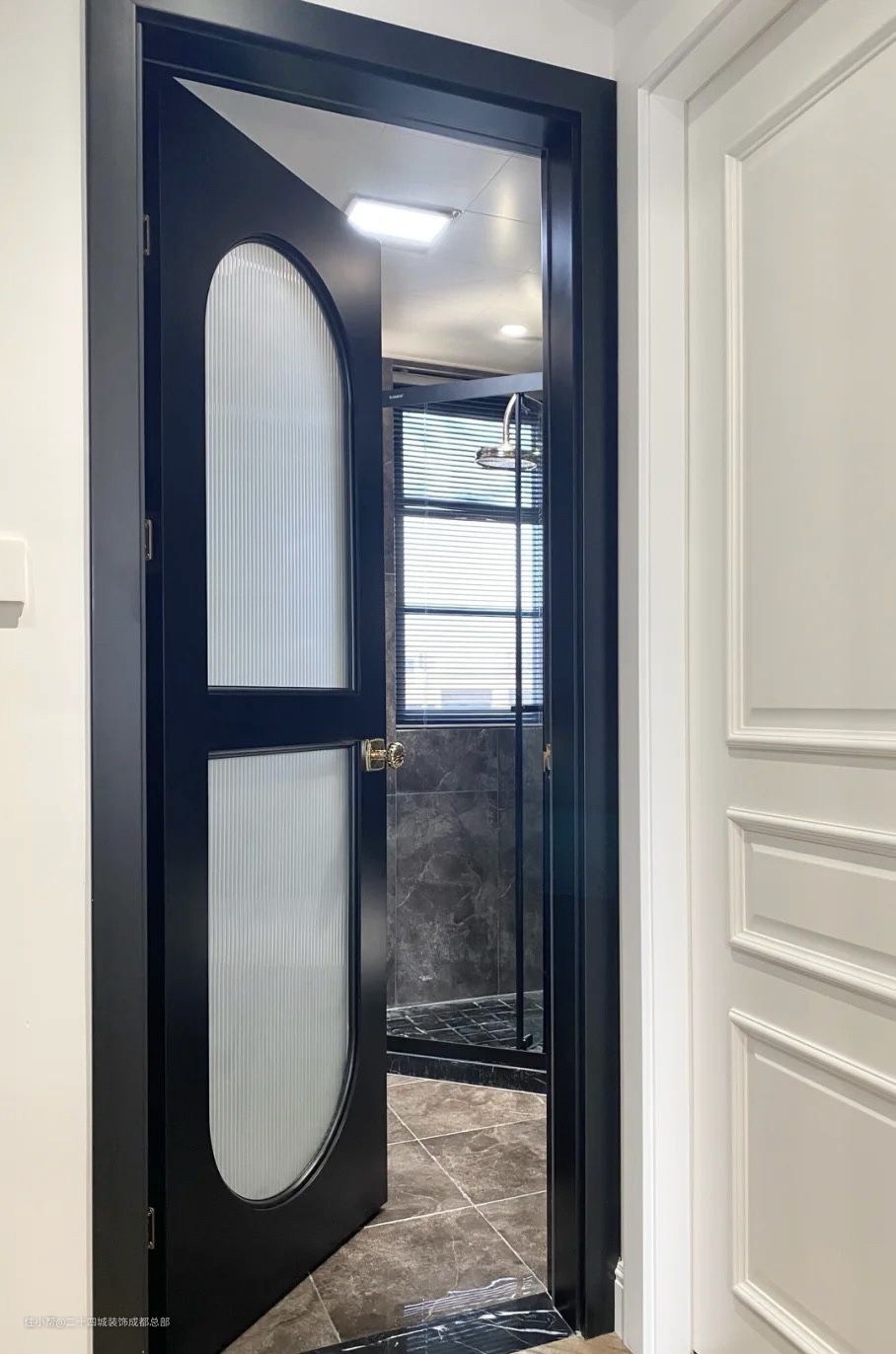 卫生间设计了黑色的门搭配长虹玻璃,颜值很高,同时长虹玻璃起到了半遮挡保护隐私的作用,又不阻碍光线的通透性,给人以轻盈的质感。