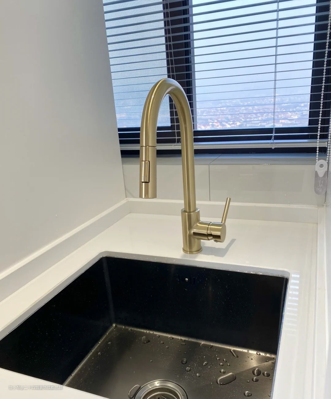 黑色的水槽,简洁高级同时洋溢着神秘感,搭配金色的水龙头,方便使用颜值高,颜值与高级感并存。