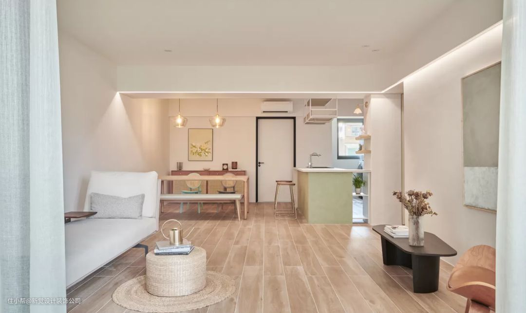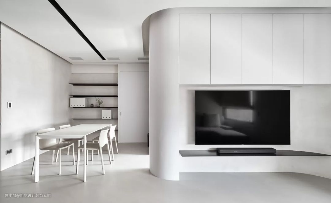 水泥白即是带灰色调的白,这样的白色会看起来更有雾感,虽属于偏冷调的白,但比起纯白色又更柔和些。空间全部使用纯白的话可能会过于冰冷,多了灰色调的调和,可以让空间感觉更有温度。而灰白色放在客厅、卧室或餐厅都十分适合,可以让空间感觉更加有深度且放大