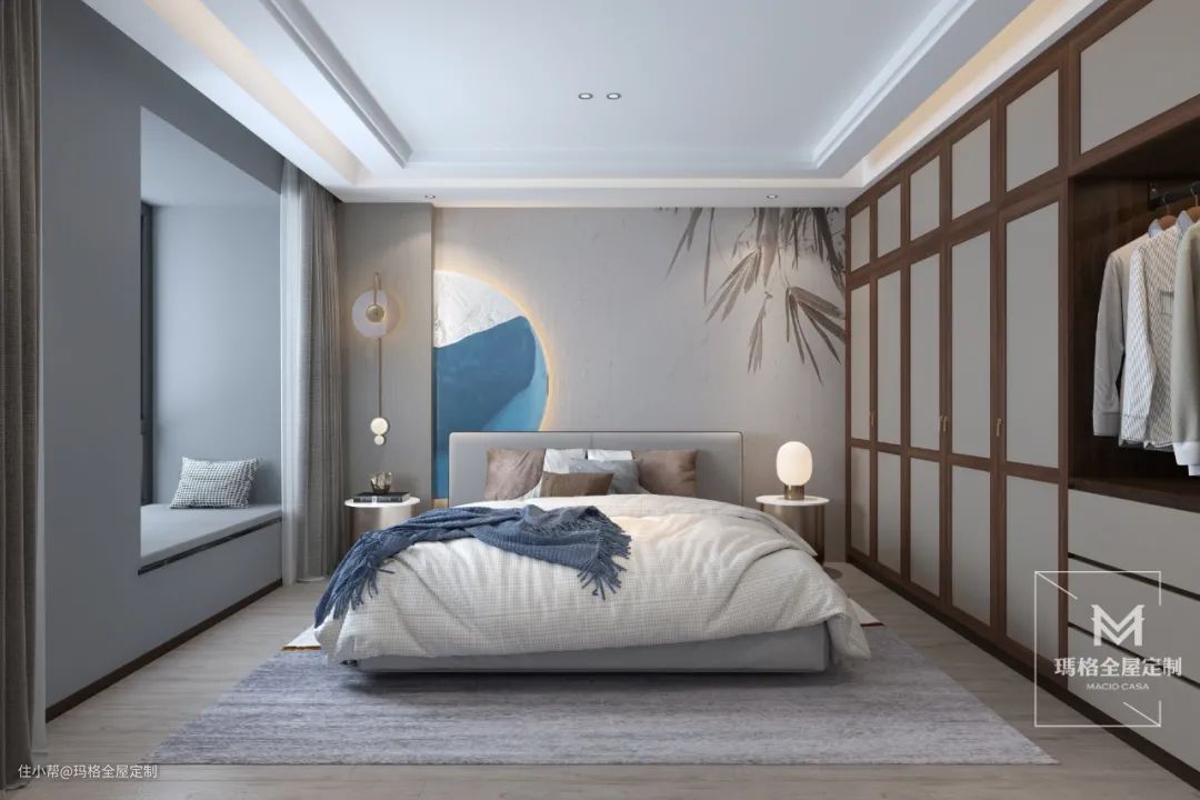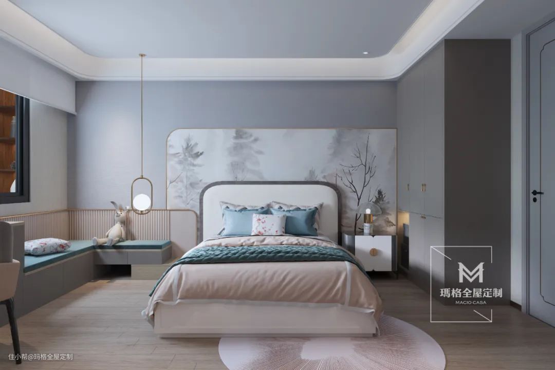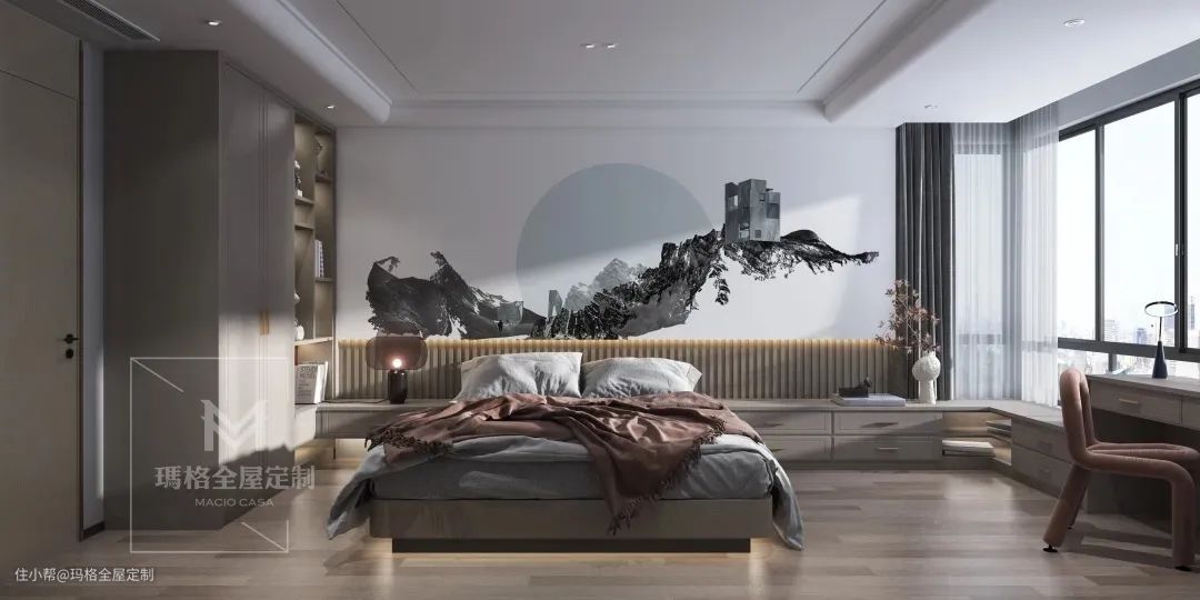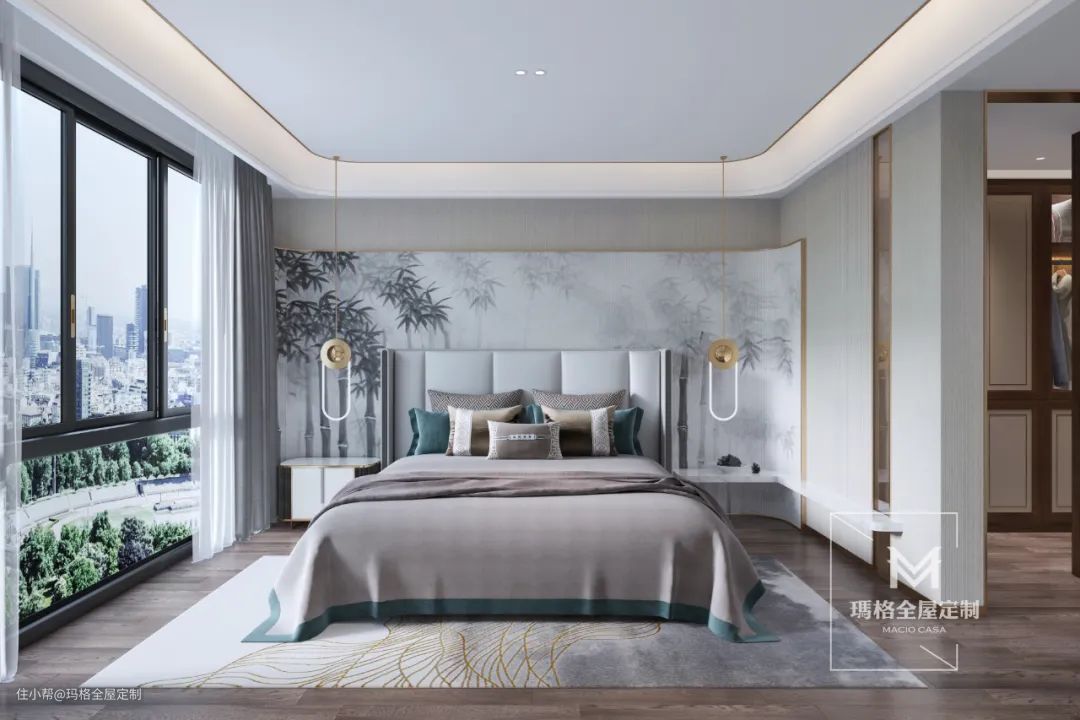 卧室空间线条简约,用色考究,分外雅致。床头背景墙运用了水墨画等艺术画作,营造出清雅韵律的空间之美,恰到好处的东方印象便在此显露。