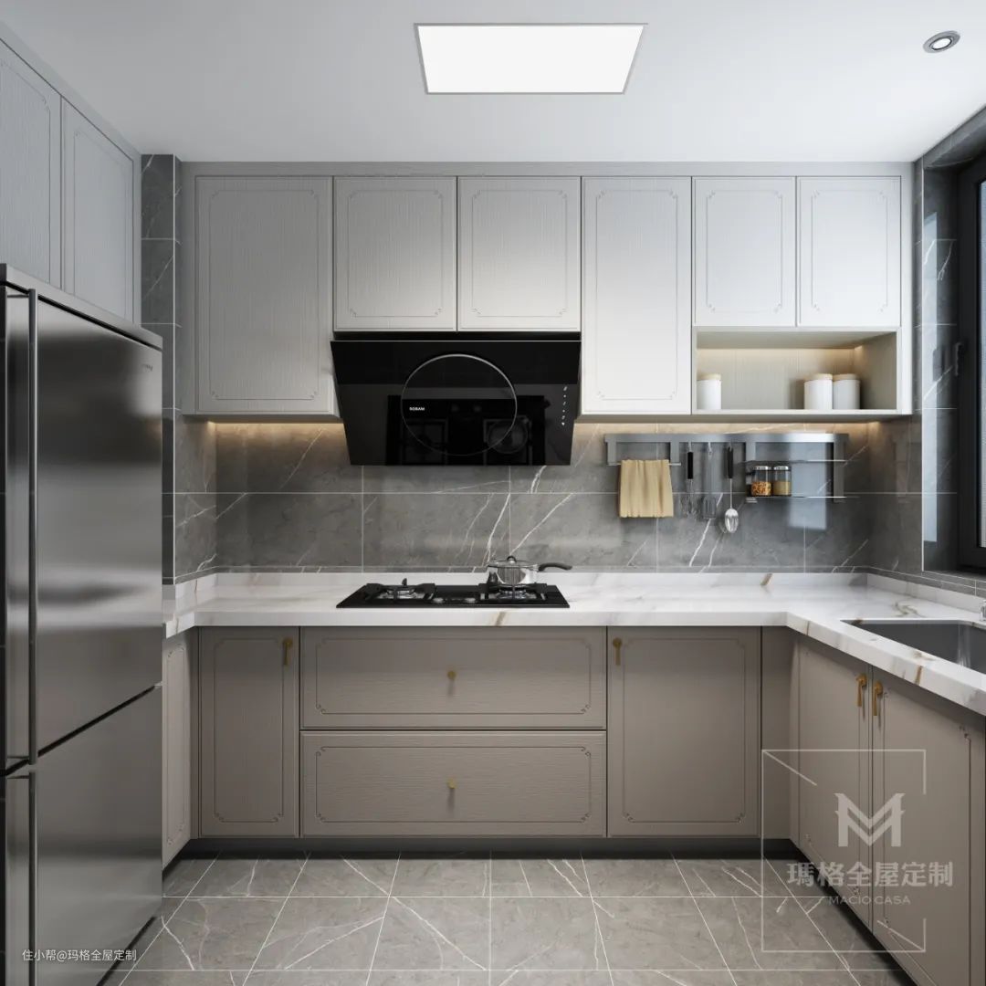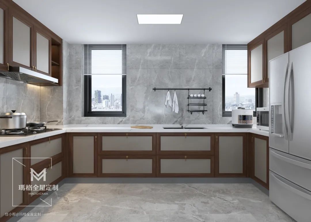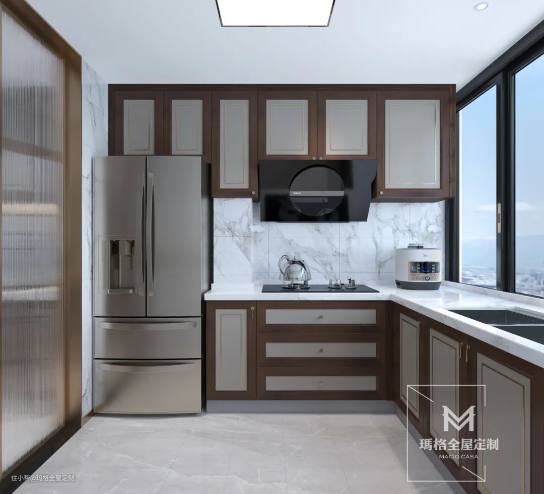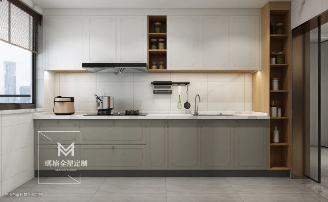 依据厨房的洗、切、煮动线设计,窗户引入日光,木制柜体和浅色石材的组合,将中式的意蕴用现代的手法阐释出来。另外,淡朴的厨柜外观让厨房格调增加了些许文艺气息。