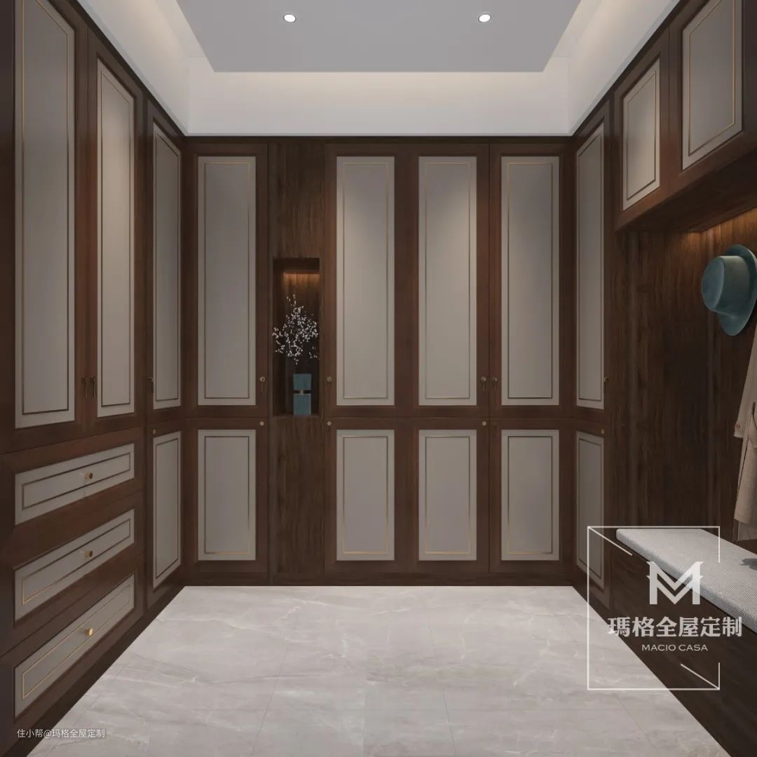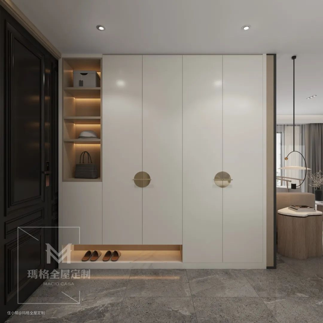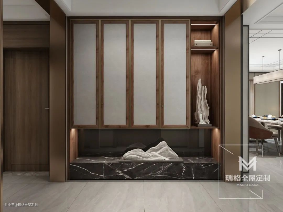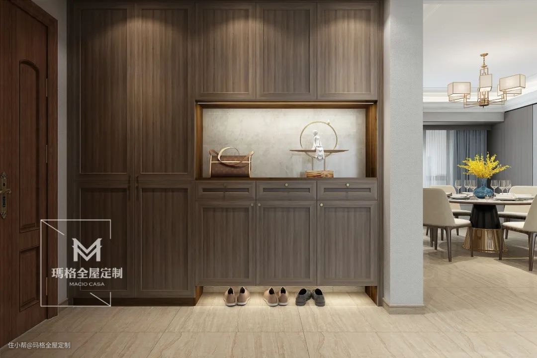 简约家具线条糅杂现代化质感,独立的鞋柜,满足全家人的鞋子收纳,部分开敞柜体,在中式元素的点缀下,灵动又不失古雅。