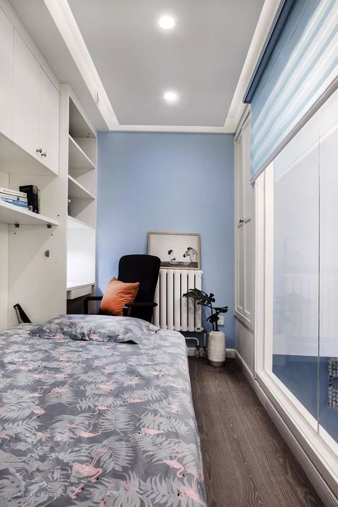 平时床被藏在柜子里面,空间看起来宽敞多了,把柜子和书桌结合起来,在靠窗的地方做个隔板书桌,看书、学习都更加舒适。