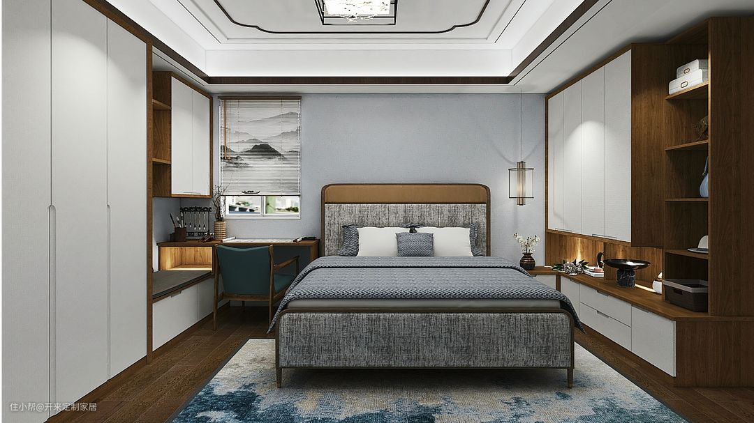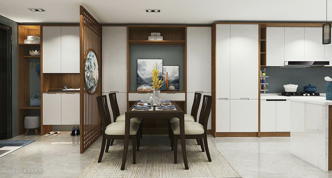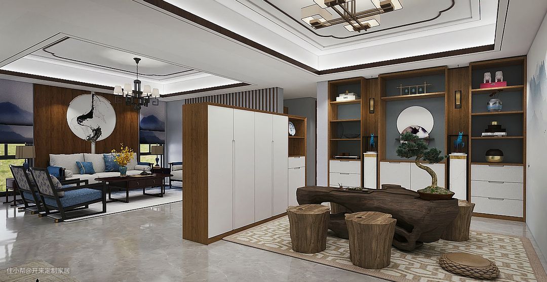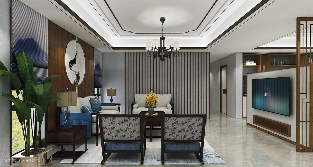 开来家居全屋定制|全屋设计|中式风格装修设计|靛蓝色软装|中式水墨意境|客餐厨开放式布局|现代中式简约舒适
