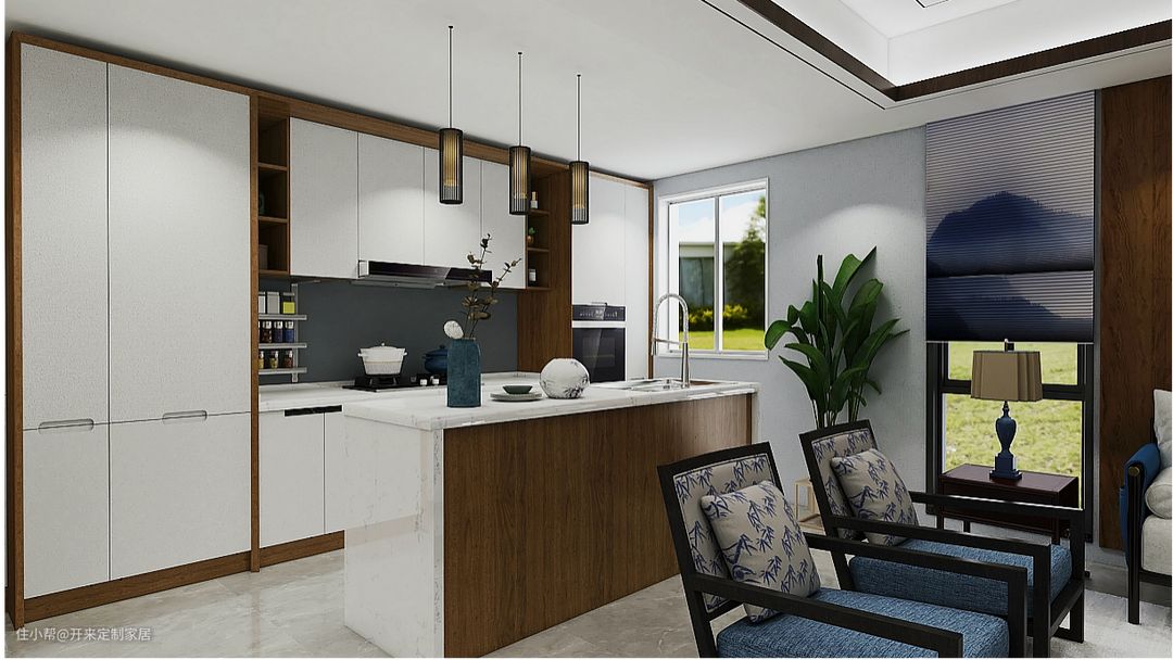 (图七)开放式厨房,橱柜亚麻布纹简白色感,局部点缀胡桃木开架,岛台水槽设计,时尚高级,随时随地开启家庭沙龙的趣味。