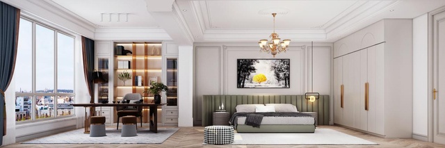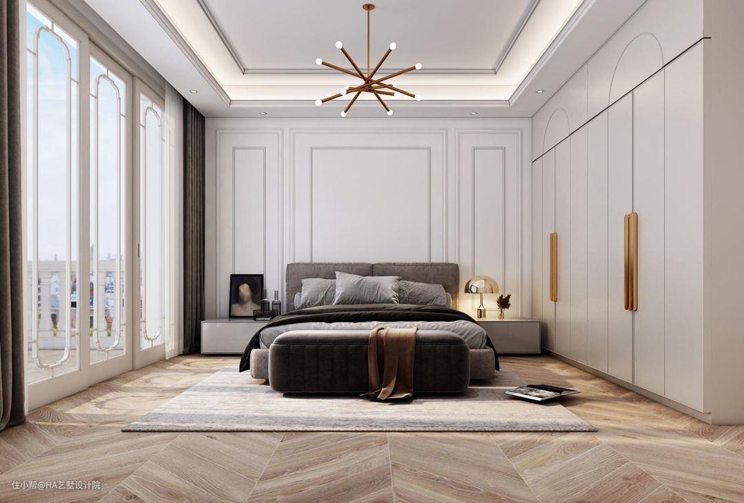 次卧的整体颜色搭配偏向于米色,灰色,再以鎏金色作为点缀,正对面线条硬朗的切割对称背景墙,渲染出优雅贵气的氛围,侧面传统宫廷式的窗户,再次回扣法式风格繁复的浪漫,去繁就简的设计方式,使让生活多了一份惬意,掘弃了都市的快节奏和繁忙,拥抱温馨而舒适的人生。