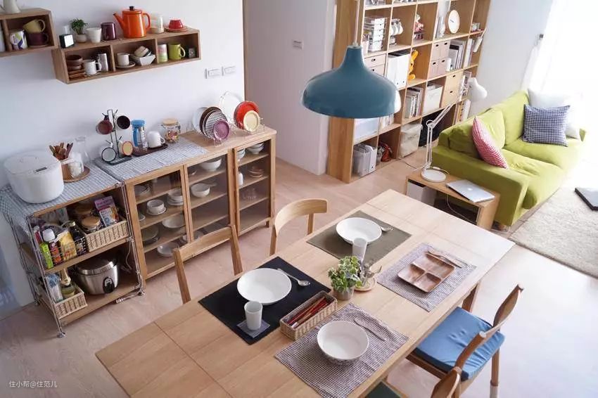 而这张大餐桌,承载的不光光是吃饭的功能,也可以是交谈、读书、学习的居心之地,功能三合一,便会释放出更多“空间”来。
