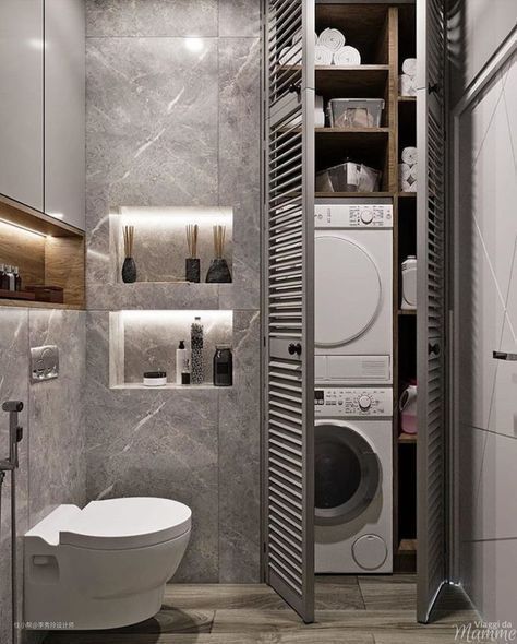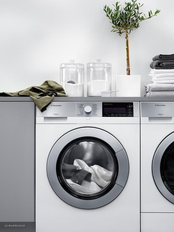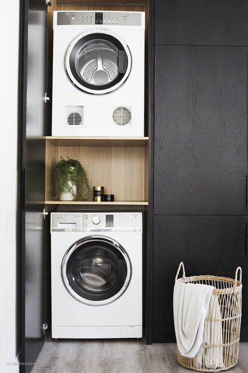 若卫生间内的空间足够,洗衣机和烘干机完全可以放在卫生间里,洗完澡直接洗衣烘干: