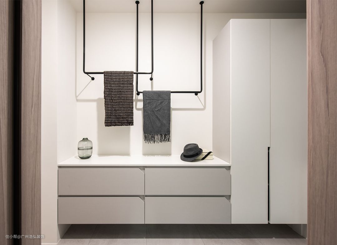 卫浴间入口对向空间,设置铁件吊杆及收纳平台接续长型衣柜,便于吊挂换洗衣服。由外回到房内之外套及围巾等配件,也可暂放于此。