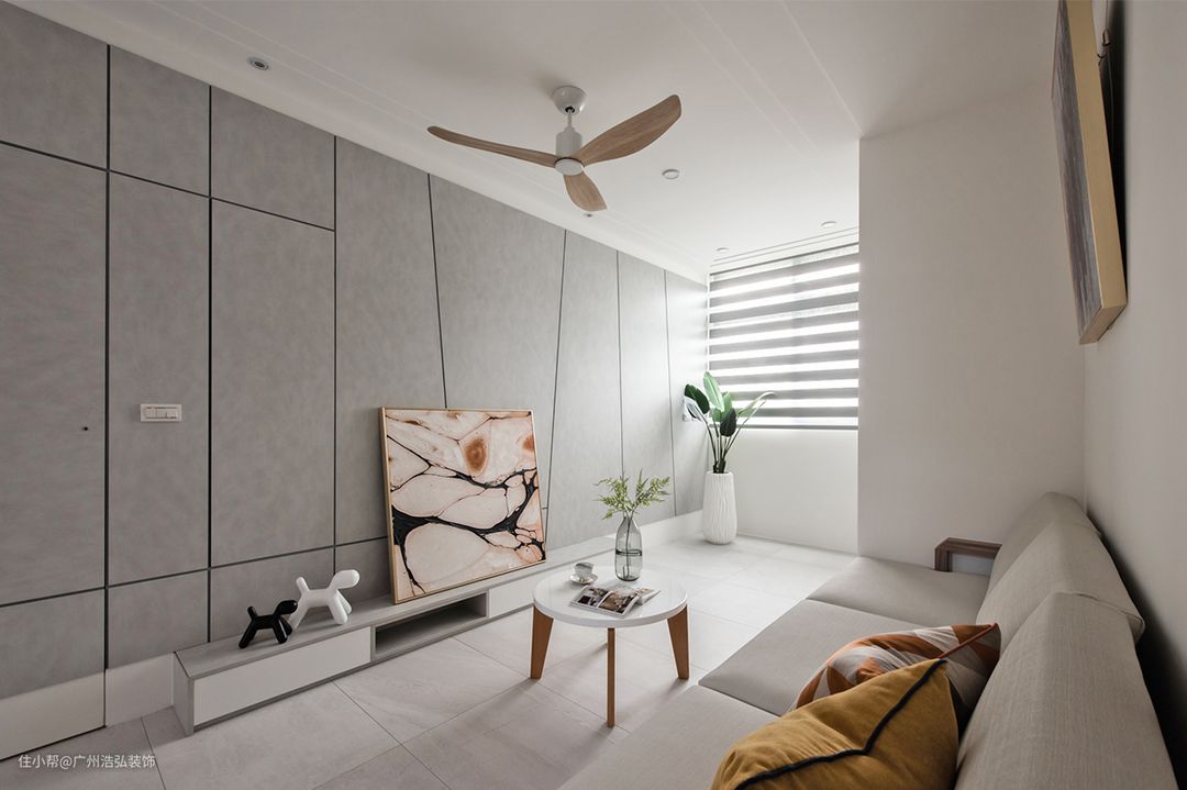 电视牆吊挂 75 吋电视仍阔绰有馀,为了不因材质分割线削弱张力,使用司曼特涂料展现清水模视感及手作镘抹纹理,并呼应全室地板岩面纹理的灰色大板砖。白灰黑组构而成的立柜嵌入外凸铁件机柜,衔接悬浮木柜,以跳色及造型递嬗细节逸趣。