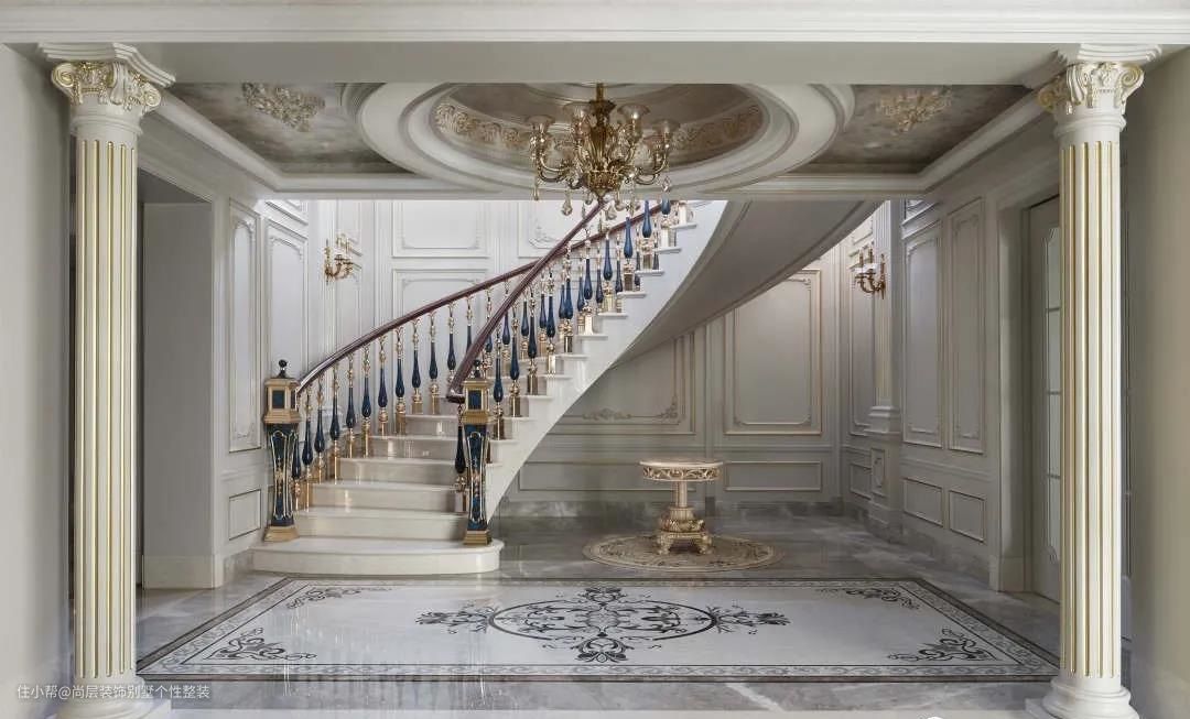 优雅的石膏线条,理性而富有秩序感,从客厅到楼梯间,仿佛河水穿过城间,婉转优雅地流动着,绕过笔直气派的廊柱,划过细雕花纹的华丽吊顶,沿着盘旋的阶梯通向下一个空间。
