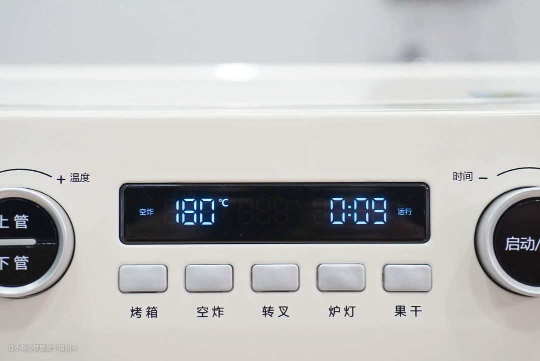屏幕下方则是几个功能按键,包括烤箱、空炸、转叉、炉灯和果干,选择空炸功能后,这款机器就化身成为一款空气炸锅,而果干功能则可以用于低温烘烤蔬果干。