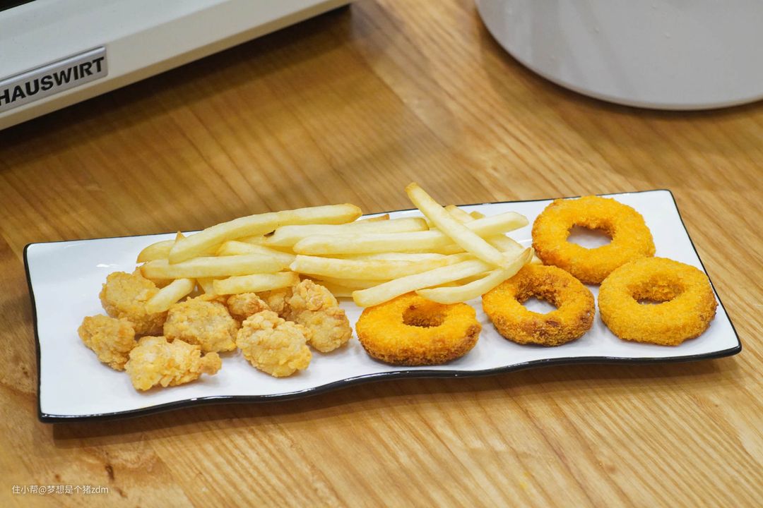 平时小孩子嘴馋,就可以直接从超市买回这种冰冻的薯条、鸡米花、鸡块、洋葱圈等食材,解冻后用这台多功能炸烤箱的空气炸功能就可以做出美味的零食。