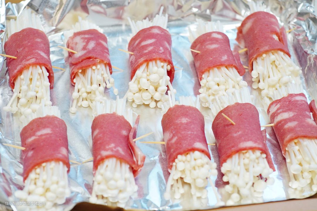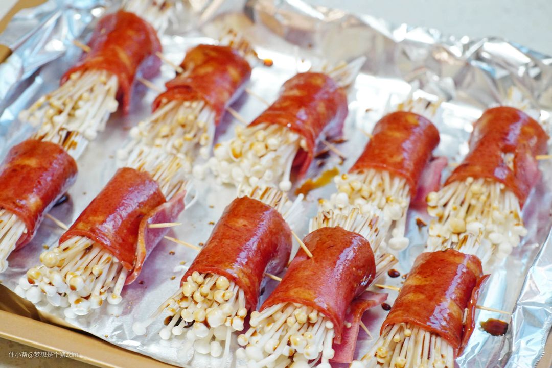 金针菇洗好,切掉后面的一截,然后用培根将金针菇卷起来,用牙签将其固定,这样就不会散开了。