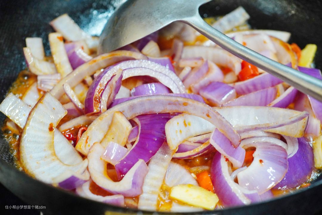 趁着烤鱼的时间,炒一点配菜,可以是土豆片,也可以是千张皮,也可以是洋葱、莴笋条,看自己的口味和爱好了,配菜不用炒太熟,加生抽、姜蒜、豆瓣酱,稍微炒一下就可以,留点汤汁。