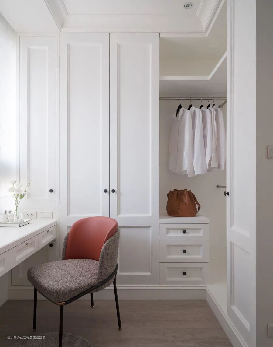 玄关藉由门框造型,划分出二进式动线,接着餐厅设置深蓝色卡座,打造姐妹淘喝下午茶的聚会场所。而通往私领域的双开门设计,让人有种高雅的生活仪式感。除此之外,专为女性打造的独立更衣室,融入顶天立地的衣柜、开放式的衣物收纳,以及靠窗的化妆台,梳妆更衣超便利。