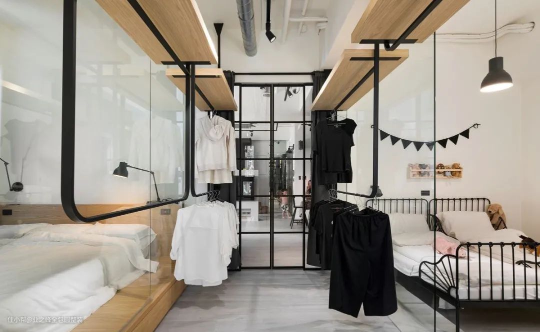 开放式的餐厨空间,让妈妈可以在一边烹饪佳肴,一边与孩子聊天,甚至还能带着小朋友一起揉面团,共享天伦之乐。客厅采取透明的玻璃隔出一间卧室,搭配开放式衣物收纳,使光线照亮主卧、小孩房及游戏室,又能用悬挂的衣服强化隐私。
