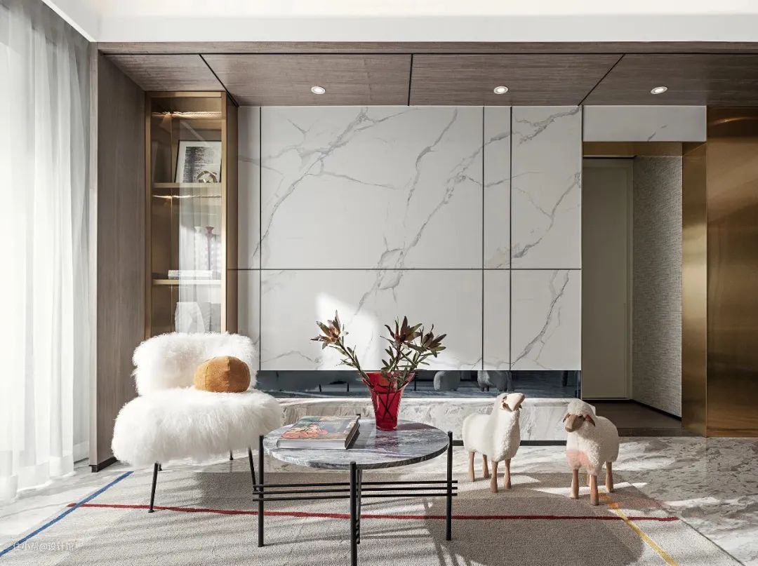 ▲电视墙左侧是一个金属材质的展示柜,加上玻璃柜门的组合,搭配上岩板电视背景墙,整个客厅都显得格外的华丽高档。