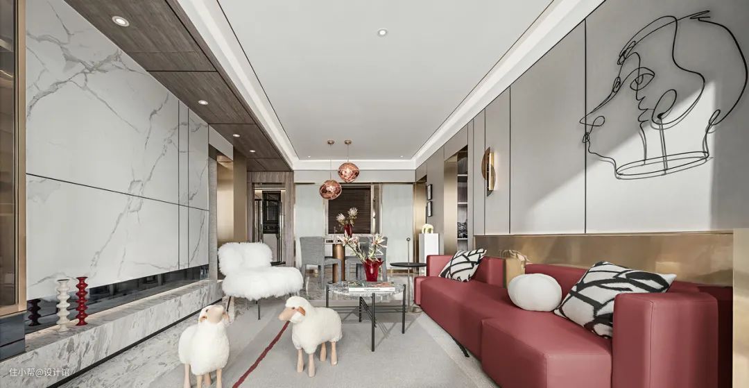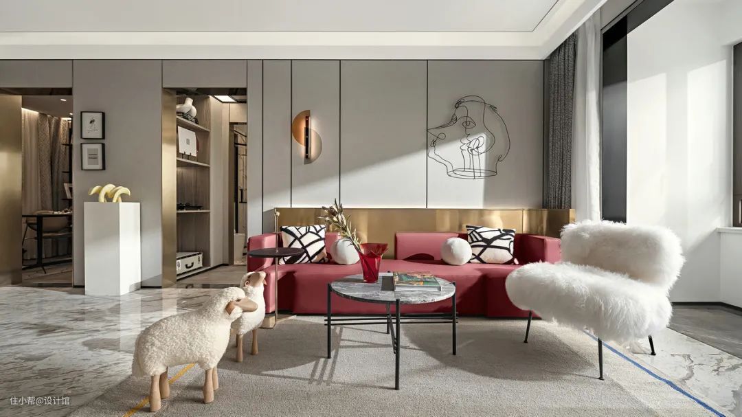 ▲玫红色的皮沙发,结合沙发墙上简约线条的装饰,布置上精致有趣的茶几与小羊造型座椅,带来了一种可爱活泼的时尚与高级气息。