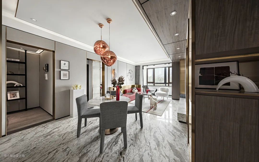 ▲餐厅与客厅空间相呼应,天花装上两盏玫瑰金色的吊灯,结合大理石餐桌与灰色餐椅组合,让用餐空间也显得精致而又有仪式感。