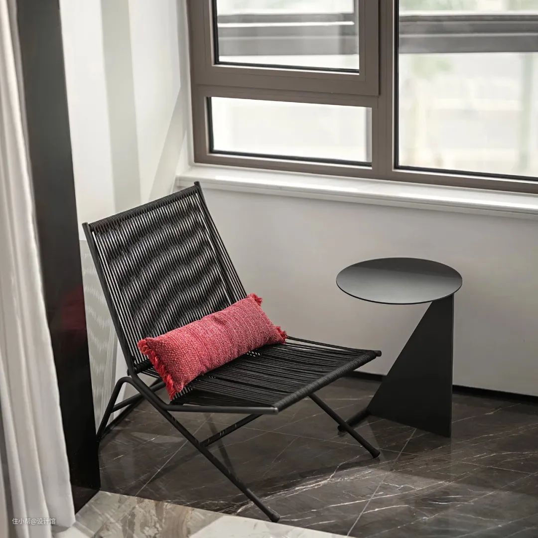 ▲独特的软装布置与配色设计,红色的亚克力花瓶插上花枝,灰色地毯上加入黄色与红色线条,也为空间增添了几分生机与活泼的气息。
