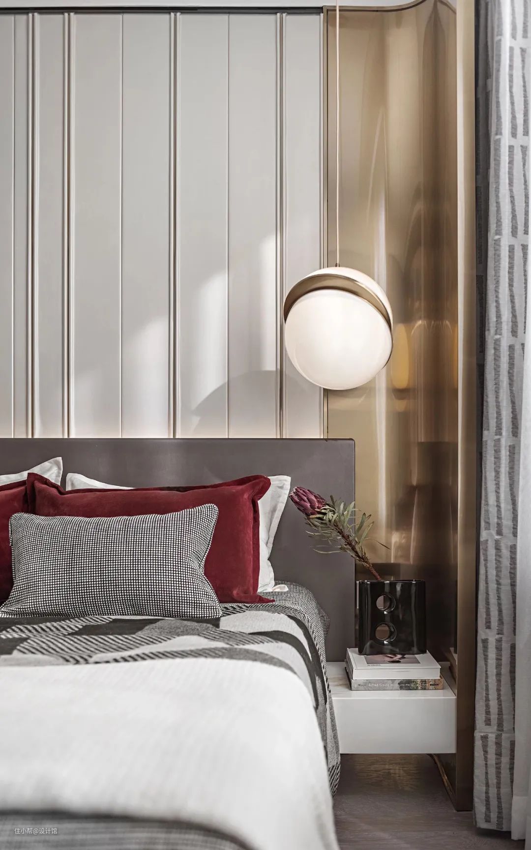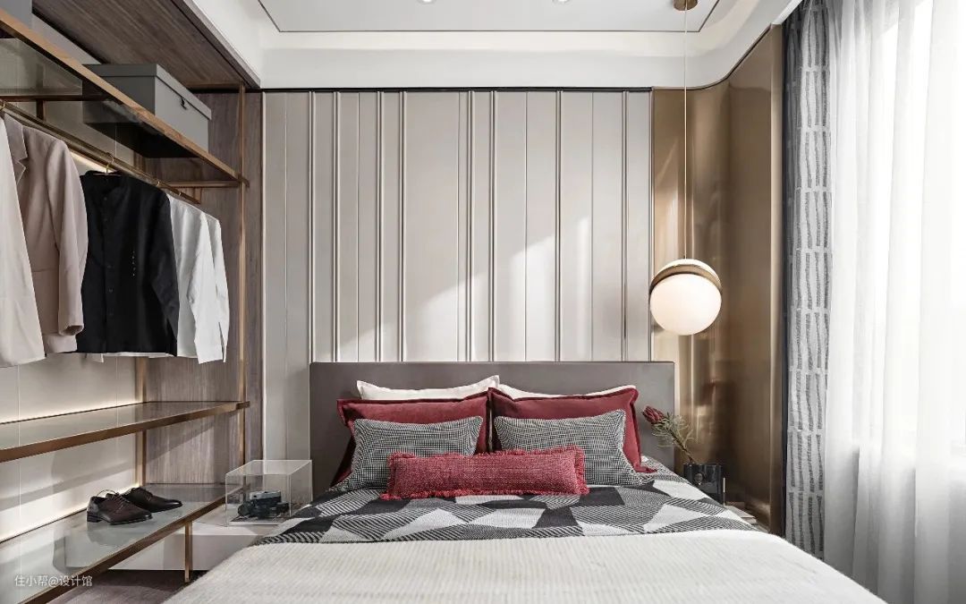 ▲卧室床头墙两侧是景色的造型,中间是带有雕花线条的护墙板,左侧的金属架衣帽间,主人衣服可以直接挂在上班,非常方便,灰色与红色组合的床铺软装,加上右侧一张球形的吊灯,也让卧室显得充满华丽时尚的高级档次。