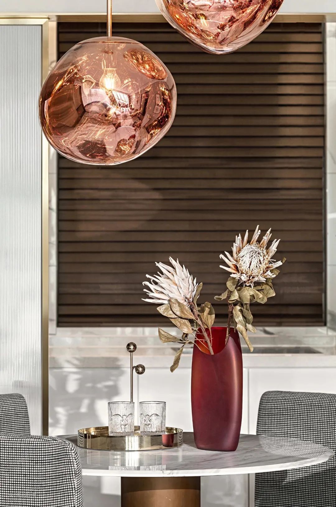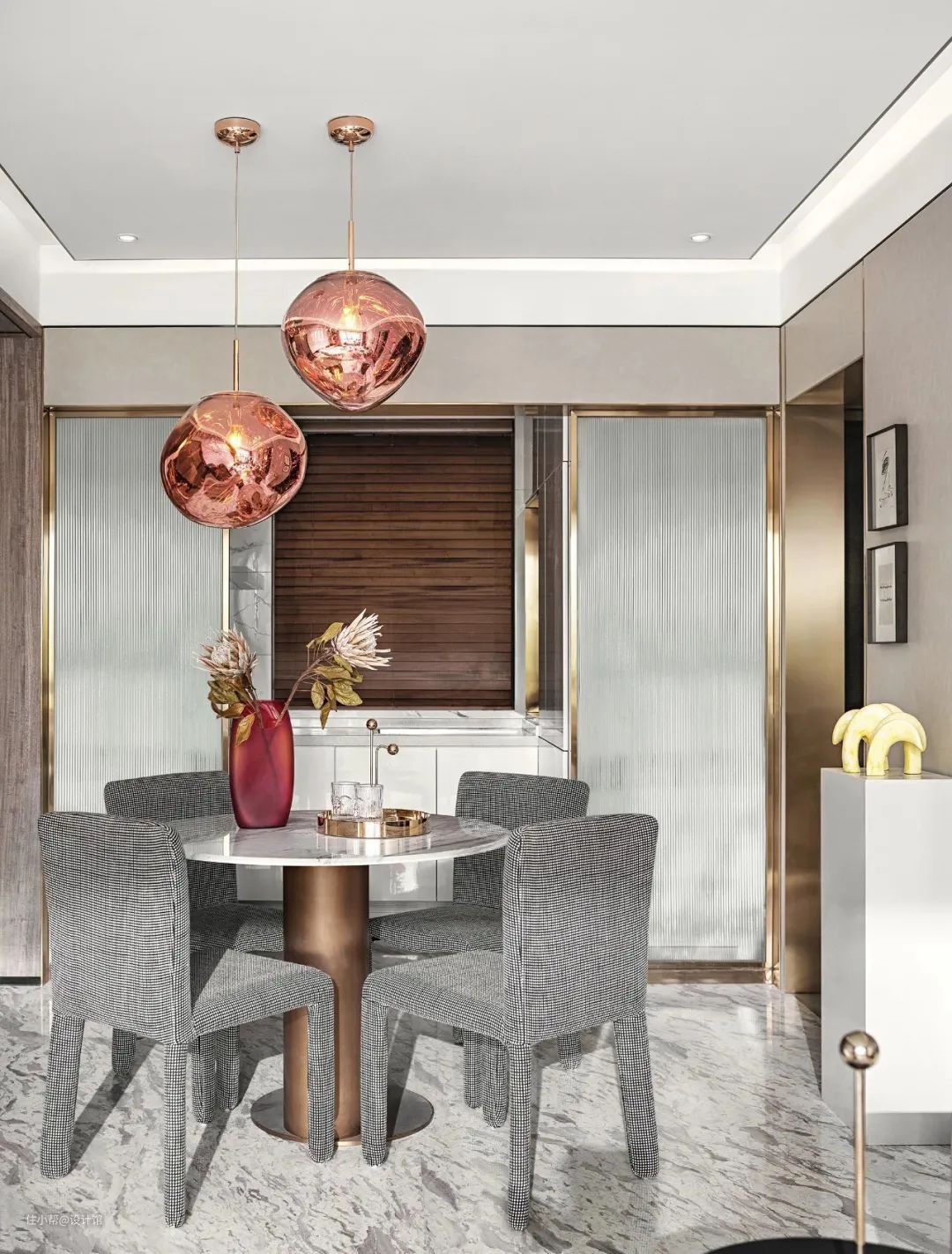 ▲布艺餐椅整体灰色基础带着白色格纹线条,结合金色金属脚架与白色岩板台面的餐桌,布置花瓶与金属、玻璃摆饰品,后方还有长虹玻璃的装饰,让空间显得更加轻奢优雅而档次。