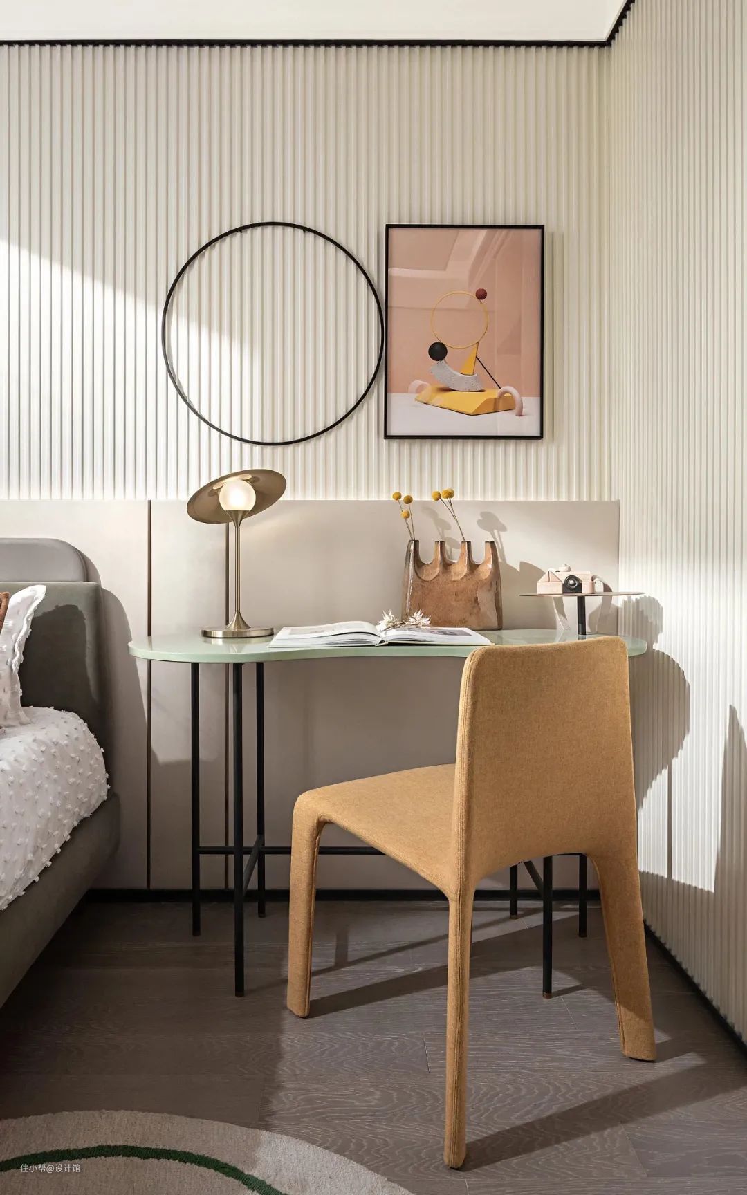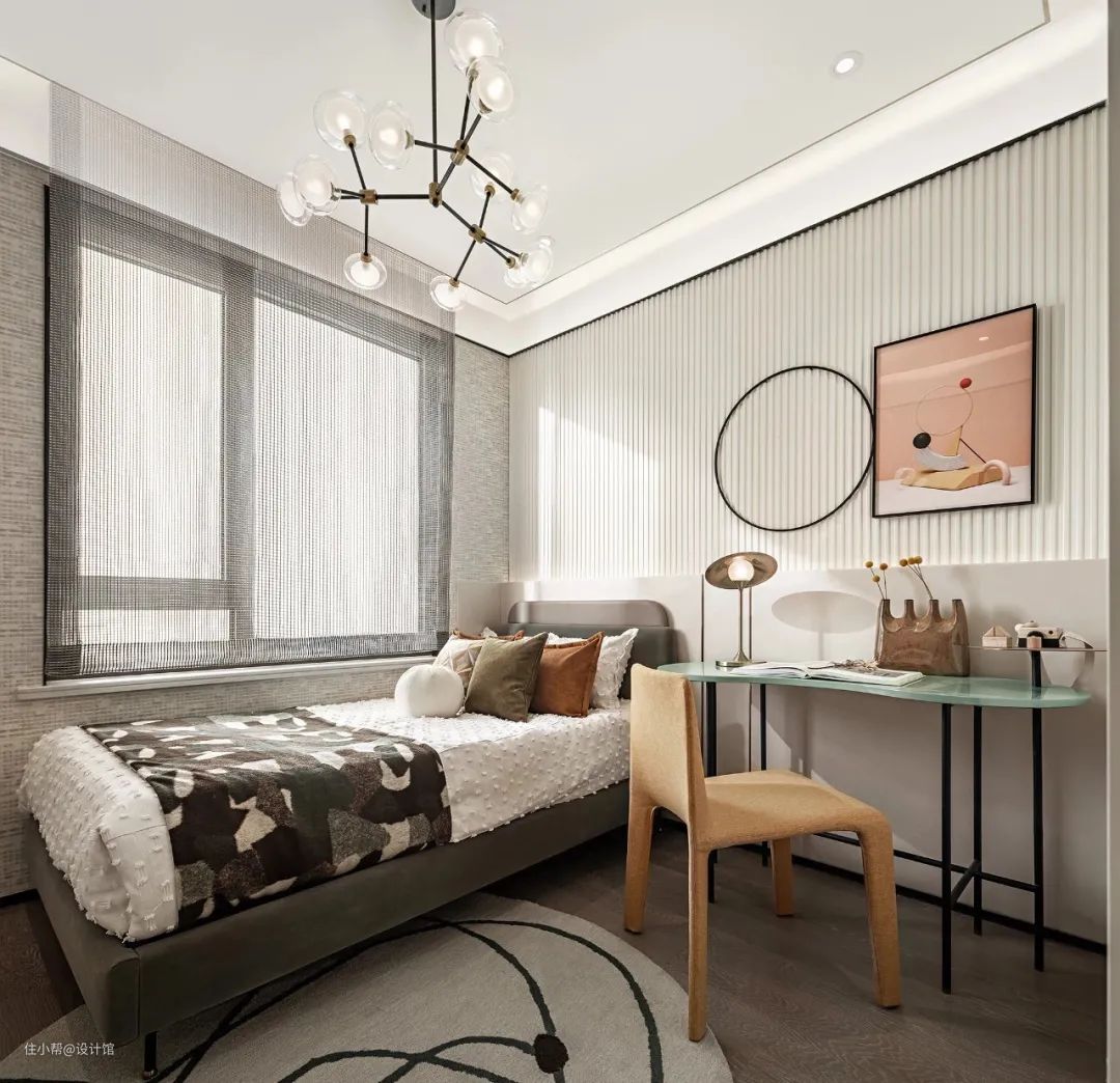 ▲儿童房的灰色床铺靠墙布置,布置黑白灰的碎花图案床单,床头墙以护墙板+长城板的组合,挂上方圆组合的装饰画,侧边墙面则是贴上灰色墙布,让空间的风格别具一格而又俏皮。床旁边一张绿色书桌+黄色椅子,也是提供了一个写作业、看书的舒适空间。