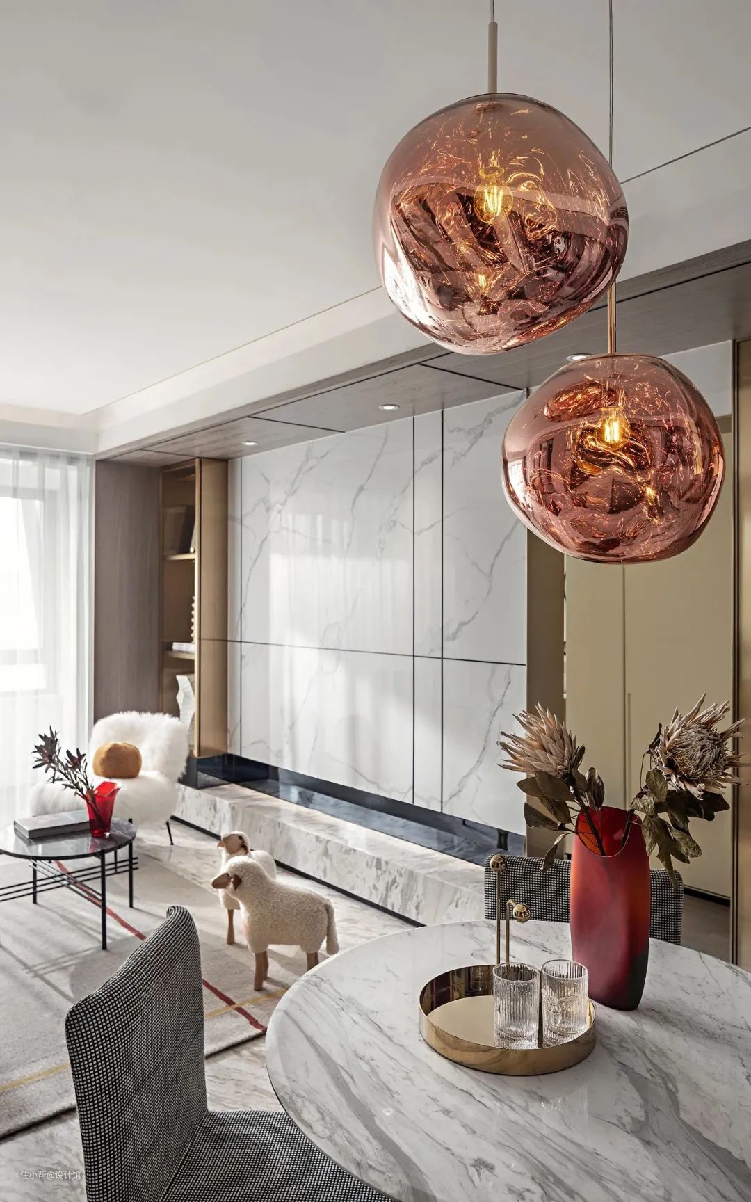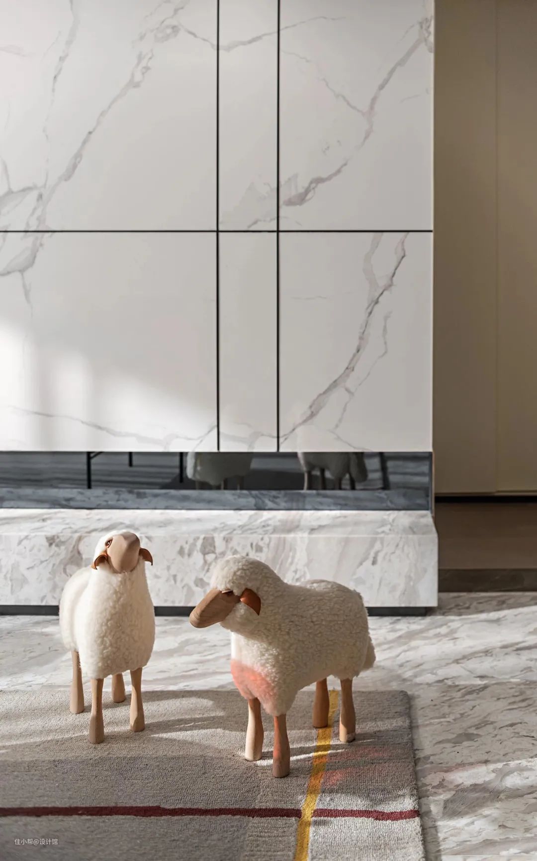 ▲圆形的石材茶几,加上小羊造型的座椅,还有绒毛坐垫与休闲椅,整个客厅都显得充满温情优雅的气质。