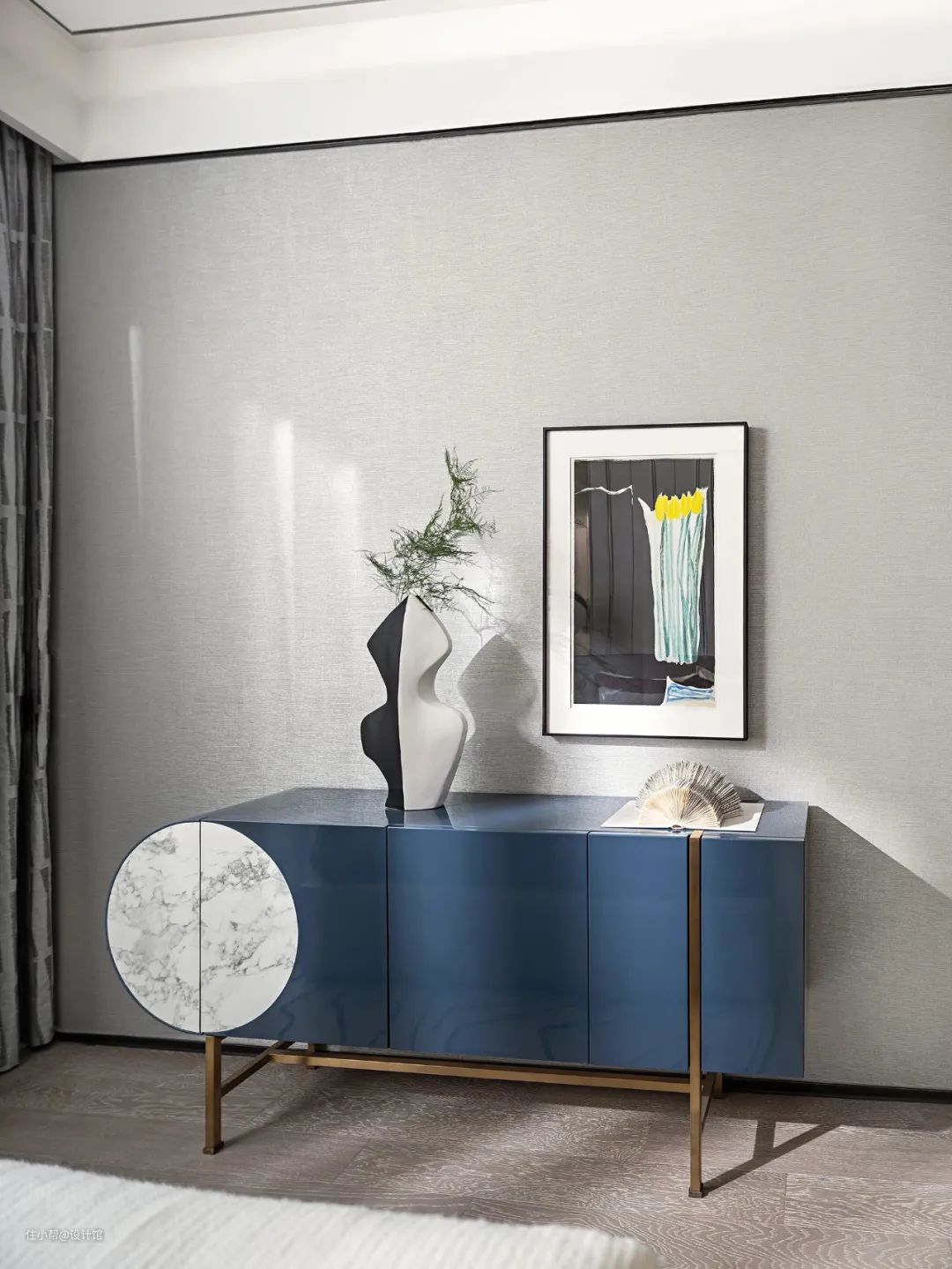 ▲床尾布置金属架的蓝色斗柜,斗柜里还加入了一个白色圆形的造型,摆上黑白色的陶艺花瓶装饰,也让空间显得更加灵活有趣。