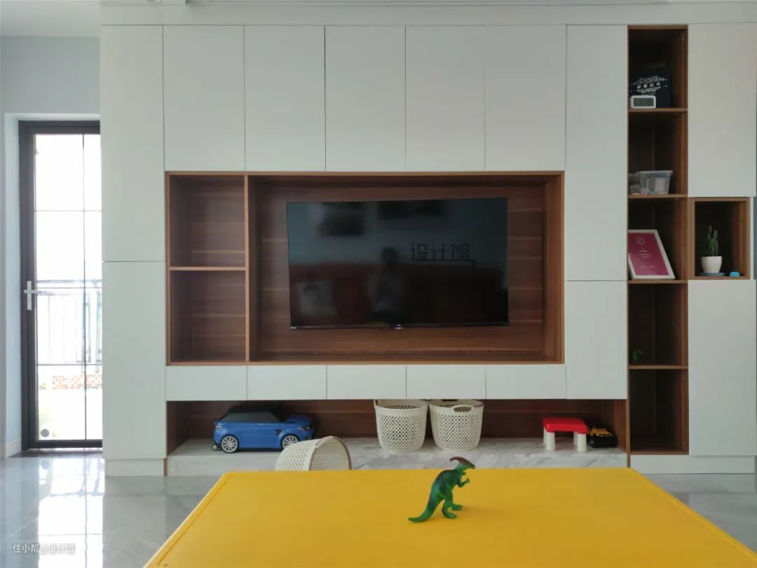 现在很多人装修电视墙的时候,都会选择整面墙都定制电视柜,这样可以为客厅带来充足的收纳储物空间,由于现在的电视机都比较轻薄,并且在定制柜做电视墙的情况,电视机一般是采取壁挂安装的方式,定制电视柜的深度做到350mm,就可以收纳大多数的常用物品了。