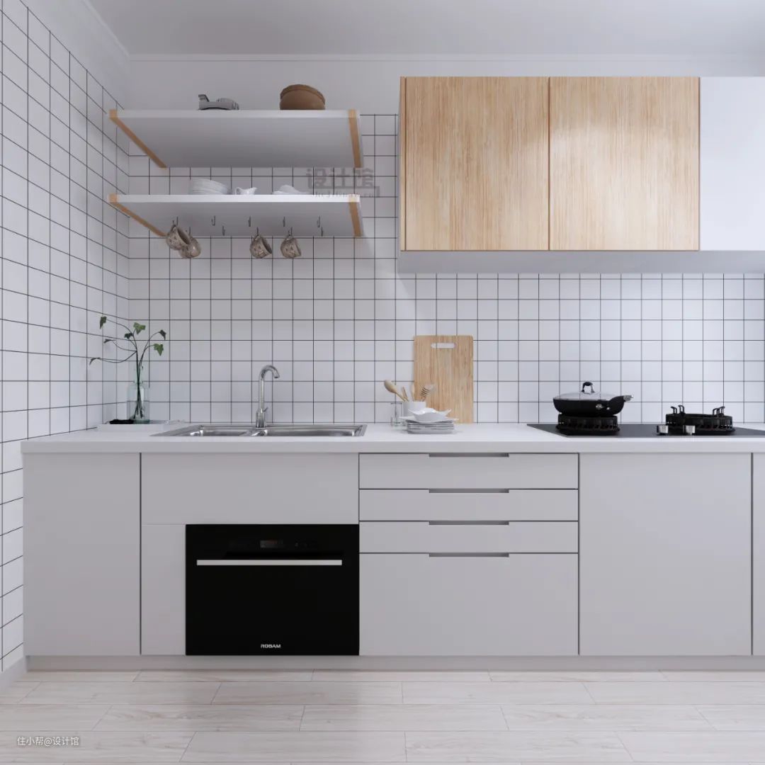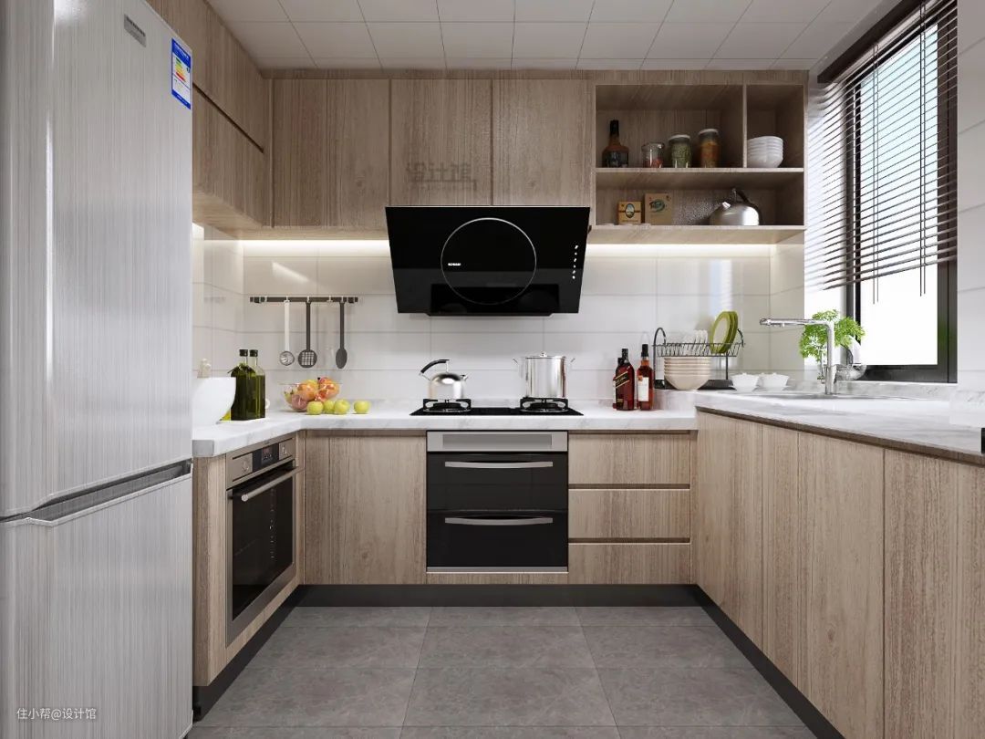 为了提升厨房空间的收纳储物空间,一般在橱柜的上方还会安装吊柜,用于收纳储备食品或厨具,这个厨房吊柜的深度一般建议做到300mm就可以了,做太深了会伸出太多、容易撞头。