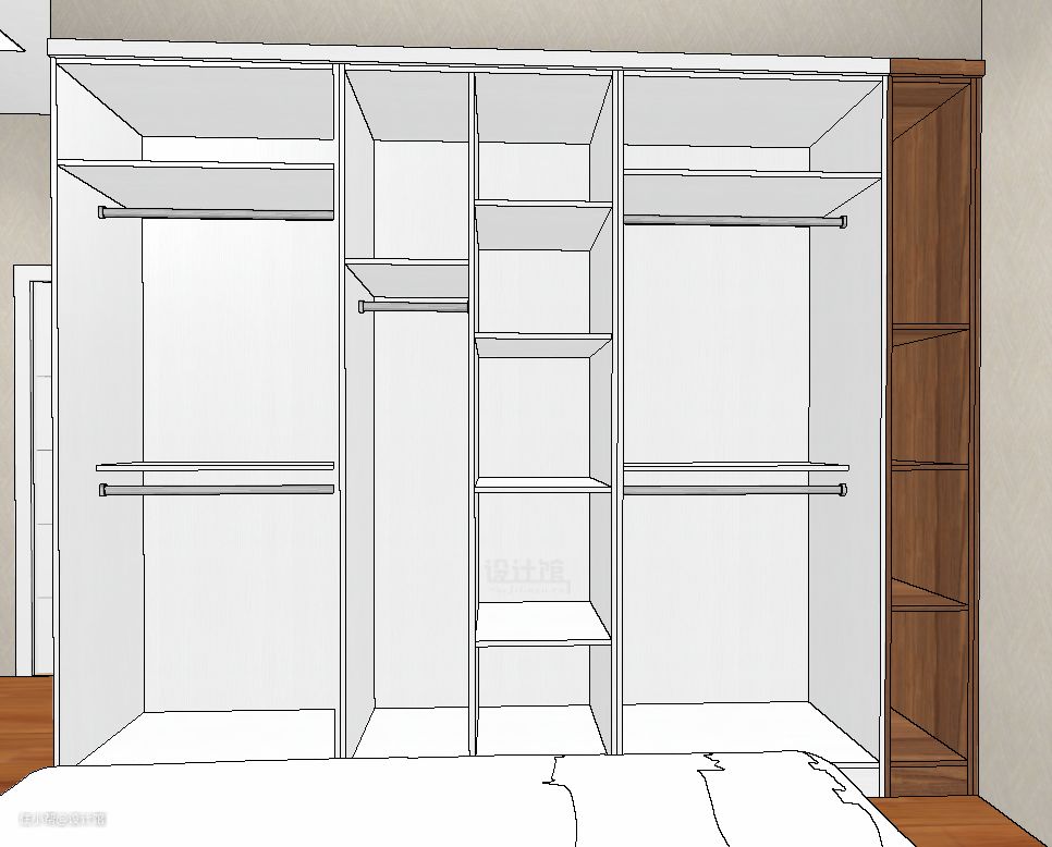 衣柜是收纳衣物的位置,衣柜的深度主要是以挂放衣物的尺寸为参照,一般衣柜的深度是600mm,然后根据空间大小、衣柜款式等,可以适当调整尺寸、控制在550-650mm之间。