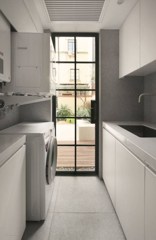 从客厅和洗衣间都能直通外边的庭院。实现了动线的洄游。设计师对室外景观做了精心的勾画。设置了休息木平台、园林坐凳、绿植区。通过黑色纤细边框玻璃门,室内外空间交相呼应。呈现出一种静谧、舒适的宜居空间。