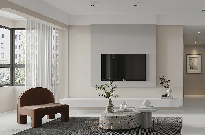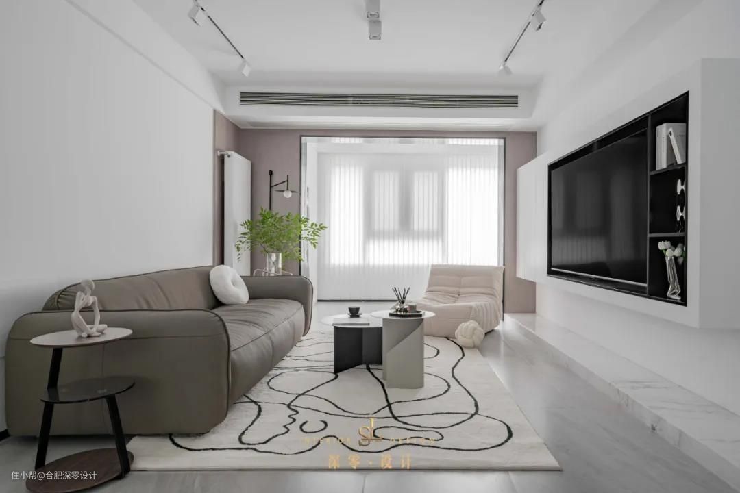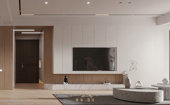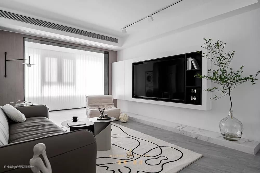 悬空设计不仅简约也够轻便,无论客厅大小都能拿捏住,从上图咱微创君泊业主家可以明显看出,这种电视墙比较注重线条和区域体块的表达,设计感和层次感会更强一些。