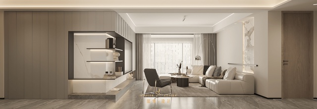 广视花园:阳台并入客厅打高柜,底部搭配大理石地台,凸显质感↓