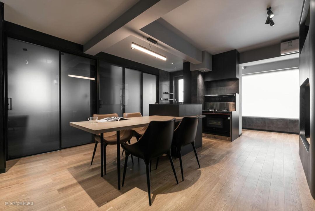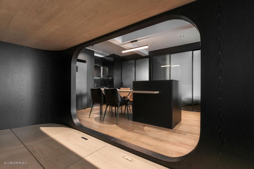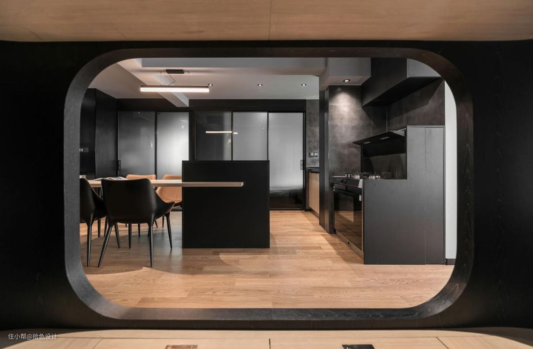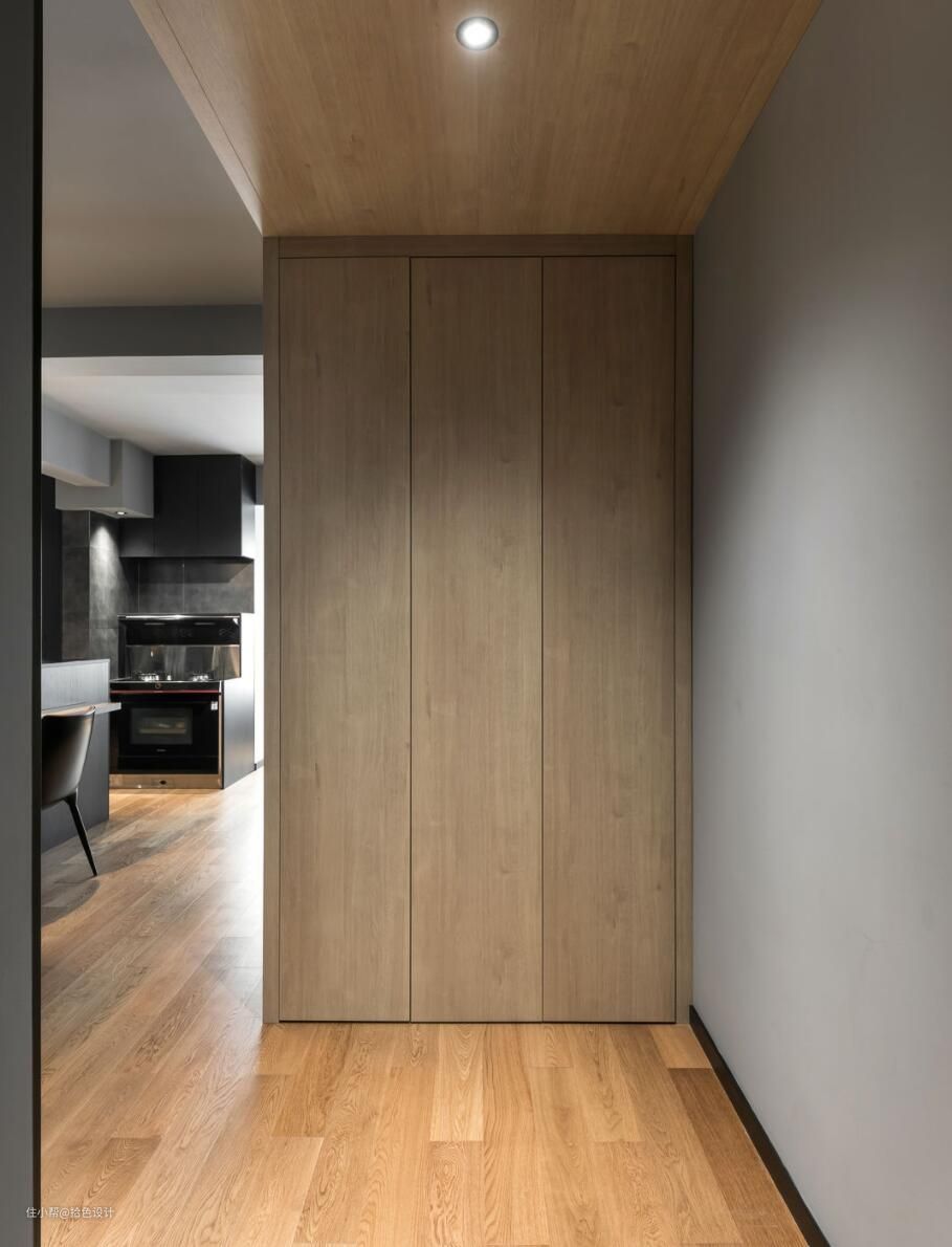 玄关看向餐厅视角,相较于常见的温暖、明亮、精致、轻奢基调,屋主家则是以少见的暗黑风定位的,再通过大量的木饰面元素平衡,真的是又酷又有温度,丝毫感受不到暗黑风所带来的压抑。