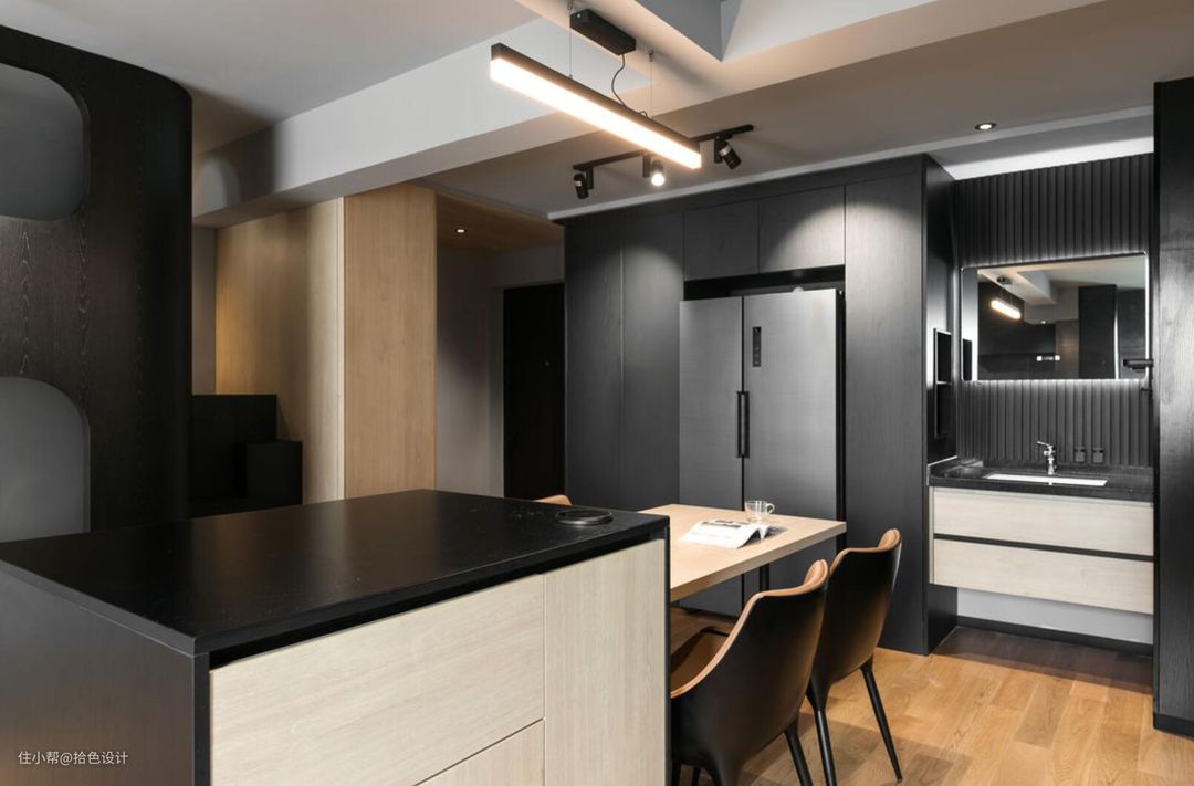 由于屋主对厨房的需求率不高,所以在空间设计上,就弱化了厨房的存在。不过临窗处的一组橱柜,以及旁边的集成灶配置,也算是满足了基本的下厨需求。况且,餐桌旁的岛台也能提供一些收纳、操作空间。