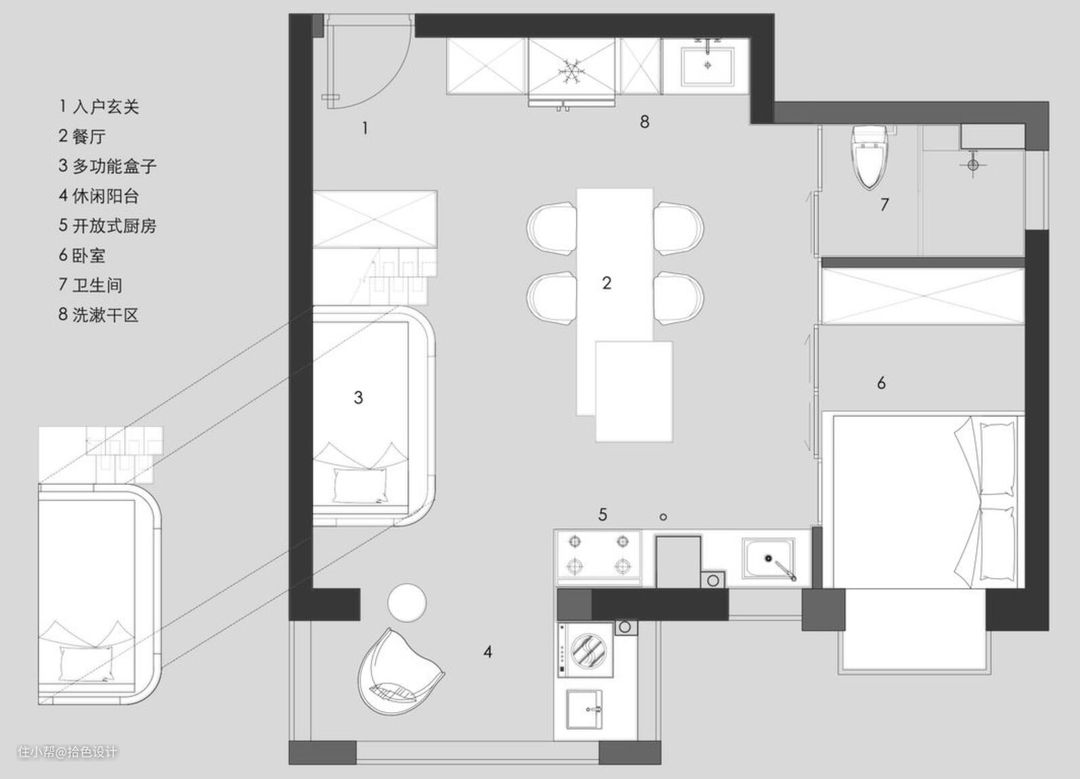 4、由于厨房的使用率不高,弱化厨房的存在,并以开放式设计。