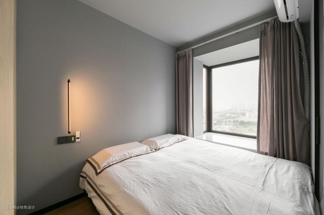 拉开玻璃移门,就是主卧室,相较于室外的暗黑系,这里则是以灰白调来定位的,巧妙营造出了舒缓、自在、无负担的睡眠环境。