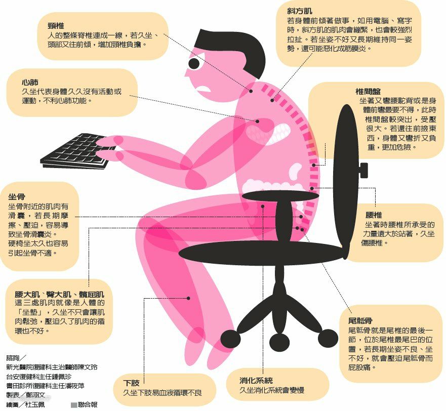 2、对于驼背坐姿的人,是不是感觉自己驼背不好马上扳过来,但是不知不觉的不知道什么时候又开始驼背了,弓背之后会给腰部一个前下的力量促使腰部肌肉紧张,久坐之后背部酸痛僵硬,头部向下受力给颈椎很大的压力,颈椎炎就是这么得的。