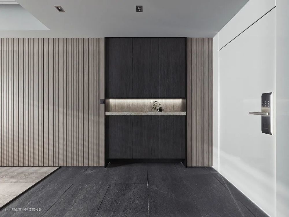 玄关是回家后进入的第一个空间,这个空间要容纳鞋柜、换鞋凳与挂钩,而在满足基本实用功能的基础,在墙面上加入木饰面的话,那么回家后的第一空间感就显得更加高级温馨了。