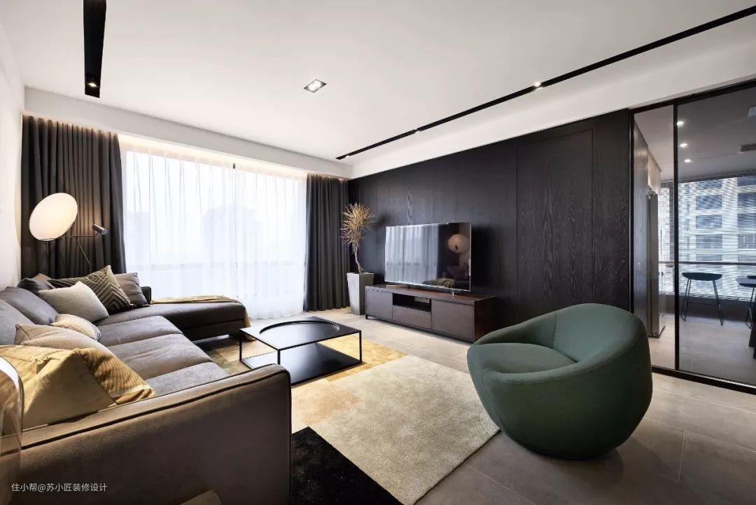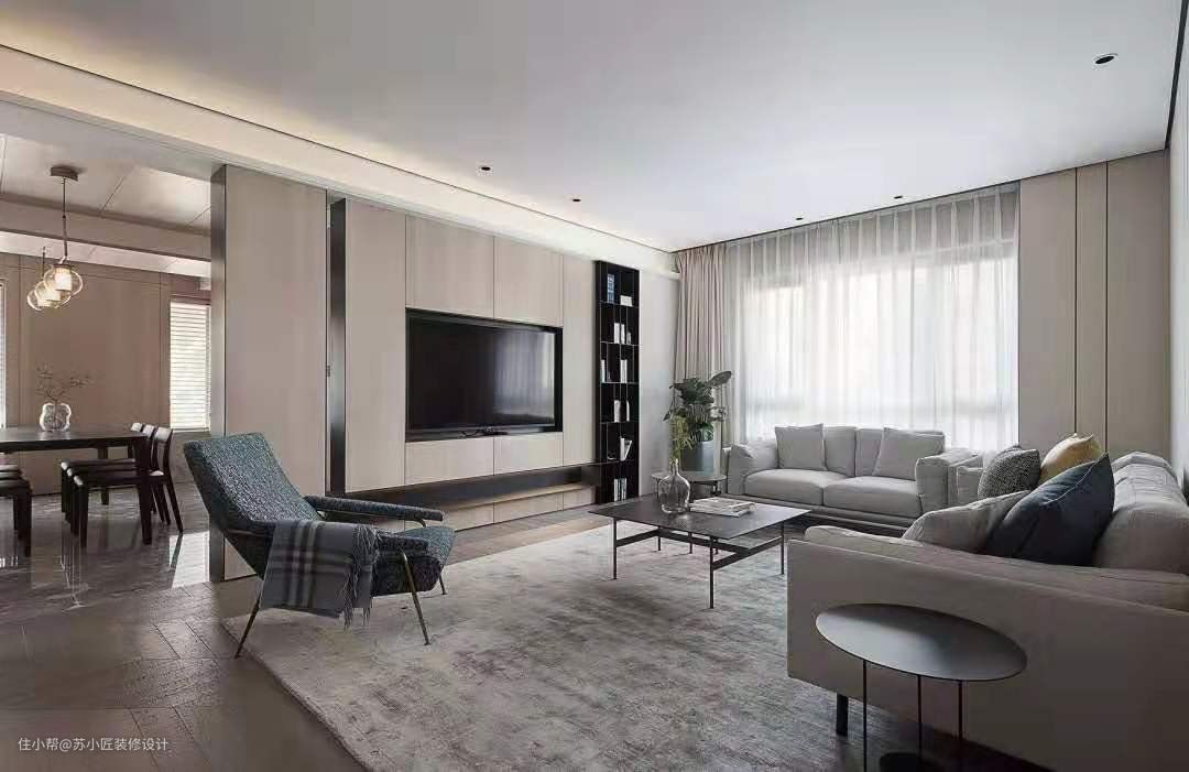沙发背景墙与电视墙对应,也是一面比较大面积的墙面,在这面墙装上木饰面,搭配木色的电视柜,再以简约的沙发布置,空间感也是非常的简约温馨而大气。
