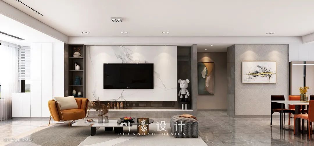 客厅空间宽敞明亮,无主灯设计简洁大方。大理石电视背景墙光亮整洁,两侧设置储物柜,开放式设计,摆放装饰物,实用又美观。