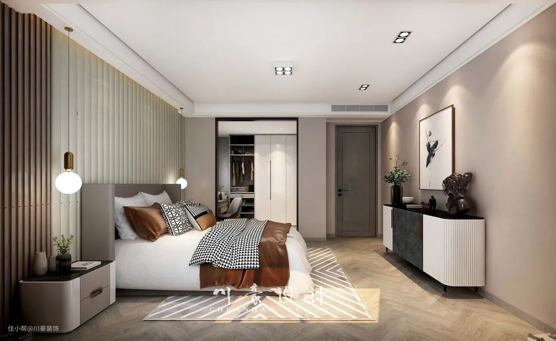 主卧无主灯设计,光线柔和。柔软舒适的大床,搭配棕色丝绒床品,轻奢感十足。软包床头椅靠舒适,现代画、床头柜绿植、装饰物的摆放,也在一定程度提升了卧室的颜值。