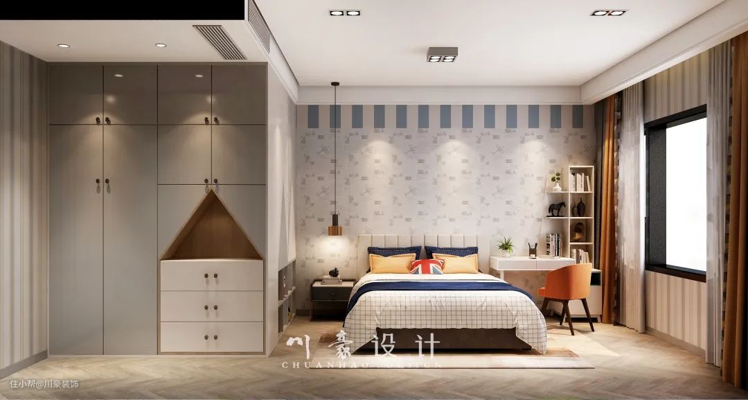 儿童房是孩子的小天地,碎花墙面床头背景墙,搭配暖色调床品,整个房间给人温暖舒适的感觉,靠墙摆放书桌和小书架,平时学习都在这方角落进行。儿童房收纳,是重中之重,设计师在入户门处设置收纳柜,用来收纳玩具和学习用具。