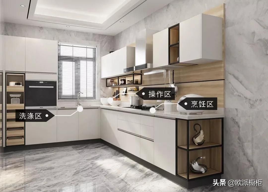 而在L型或者U型厨房中,就要利用好“黄金三角”区域,将洗涤区、操作区和烹饪区呈三角分布,缩短来回走动的路线,灵活性更强。
