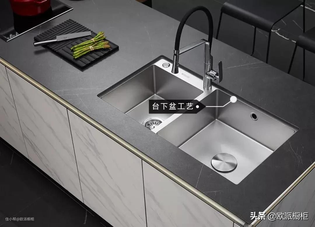 相比于台上盆,台下盆更好打理。水槽完全嵌入台面内,几乎无缝隙,不容易藏污纳垢,清理时直接用抹布抹入水槽就行,十分省心。但台下盆要十分注意承重问题,建议选择欧派橱柜等大品牌定制。
