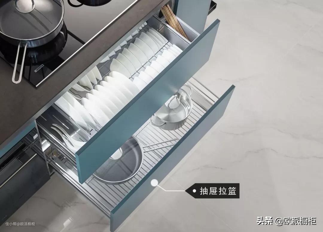 为了增大厨房的收纳空间,我们可以采用「抽屉拉篮」放置各类餐具,抽屉内各个空间进行分隔件模块化,实现了各个物品之间的有序收纳,一推一拉,随取随用。